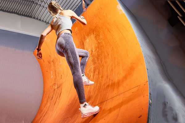Auf zwei verschiedenen Höhen musst du Geschicklichkeit und Koordination beweisen und unsere Warped Wall hinauf laufen.