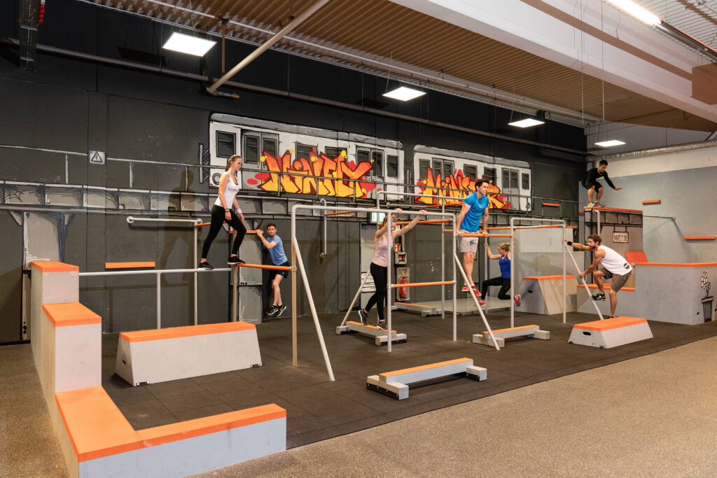 Ob Hindernisse überwinden, Saltos lernen oder neue Tricks trainieren – dieser Bereich verbindet Athletik mit Style. Zudem wartet ein 10x10m großer Springfloor auf deine Kombos.